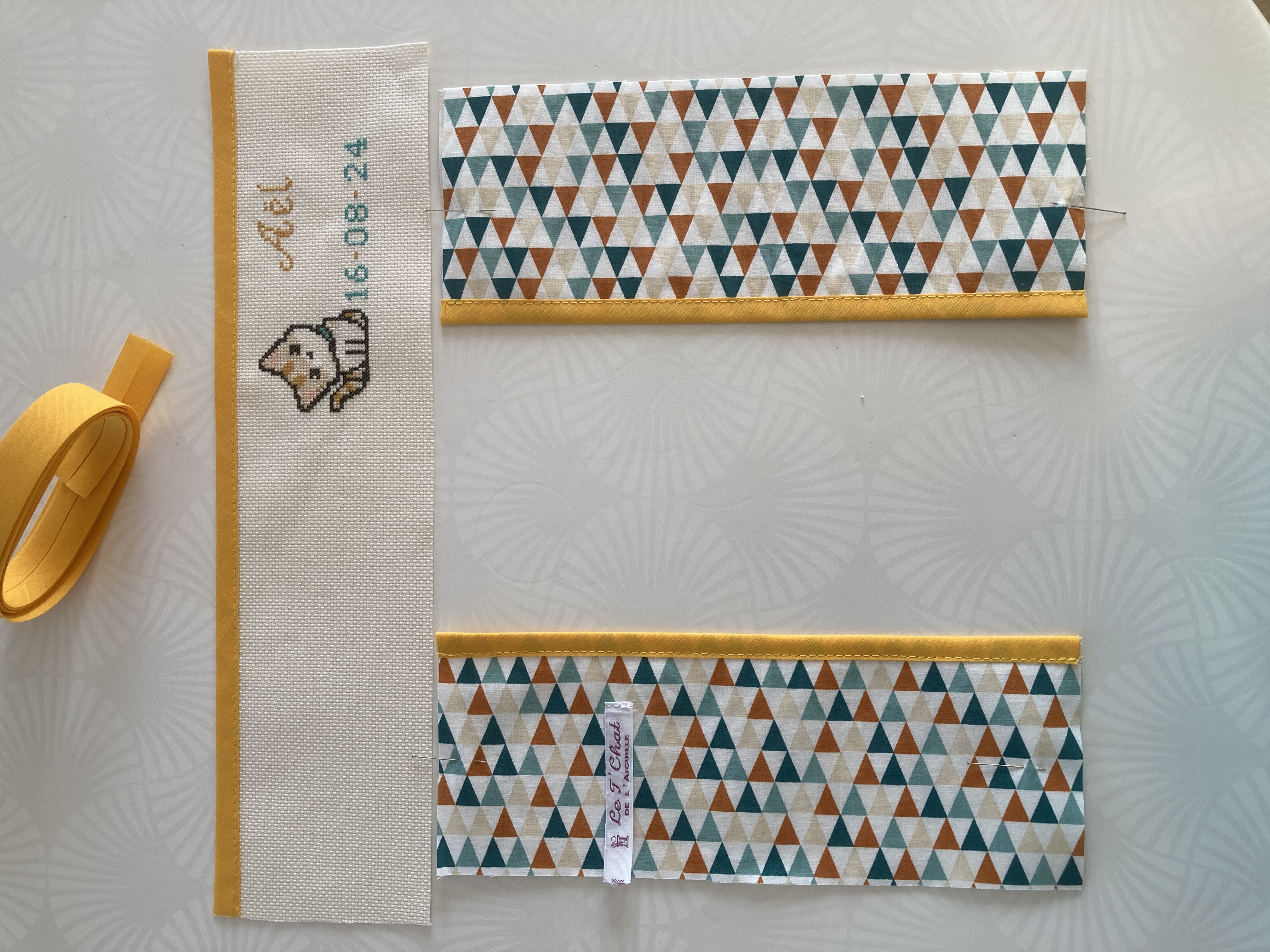 Coudre le biais sur le haut de la bande brodée et sur un des côtés des poches intérieures, l’un sur la droite et l’autre sur la gauche.